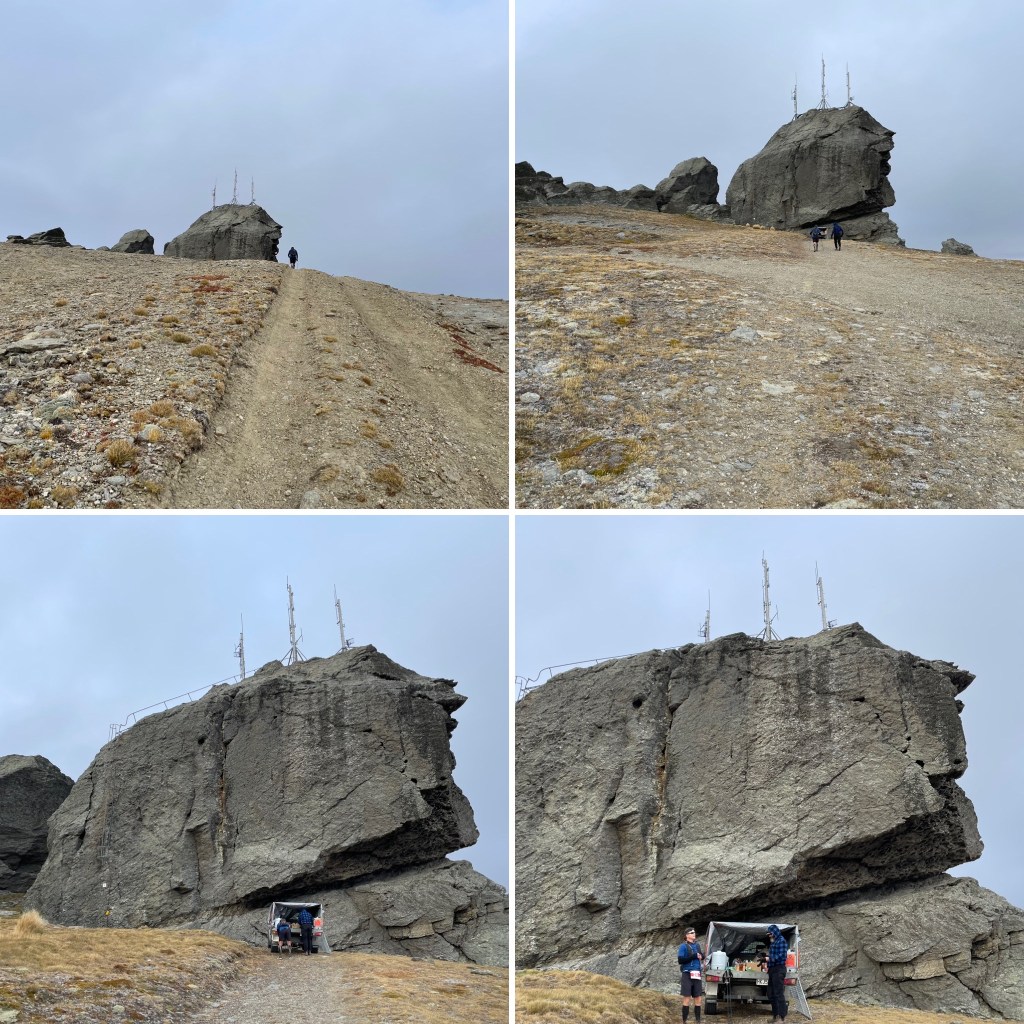 Une fois de retour à TW, je retrouve James et son sourire sincère. Il m’apparait marqué et les traits sont plus tirés qu’ils ne l’étaient dans la nuit, usés par des dizaines de kilomètres ajoutés depuis. Je suis surpris de le retrouver après mon arrêt matinal qui s’est étendu plus que de raison et espère secrètement qu’il va venir s’accrocher à ma caravane à présent délestée de son mauvais flow. Il est dans une des remorques de l’organisation en train de se ravitailler. Je ne perds pas de temps ici car malgré la chaleur humaine des lieux, elle ne parvient pas à rencontrer ma peau qui ne cesse de trembler. Après une descente de 200 mètres et le franchissement d’une barrière, je tourne sur la gauche direction Leaning rock, 4 kms aller-retour annoncés par les Marshalls. Malgré le vent, je sens le souffle de James dans mes pas et une vague de bonheur me submerge, je ne sais pas pourquoi j’ai l’impression que c’est un type bien comme on dit et son aura rayonne autour, allégeant mon cœur. Nous apercevons au loin cette formation rocheuse si caractéristique qu’un géant semble avoir posée pour coiffer la montagne.