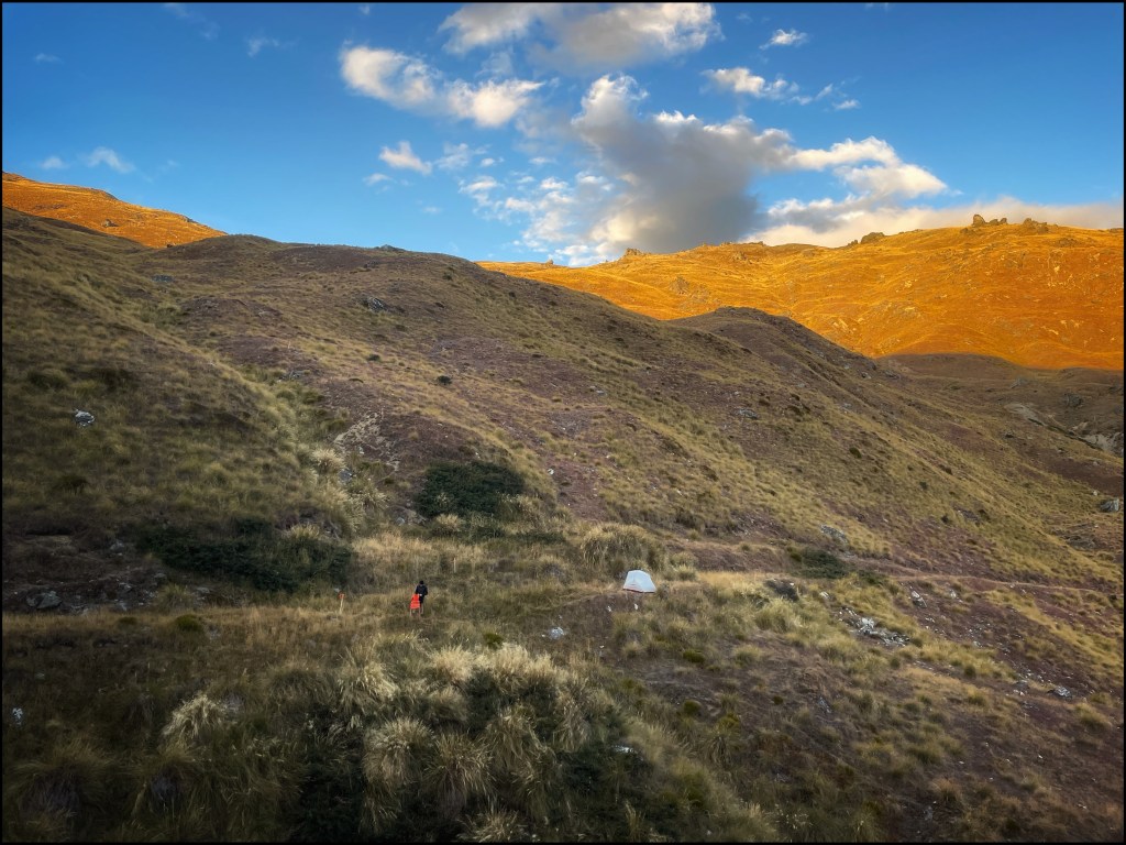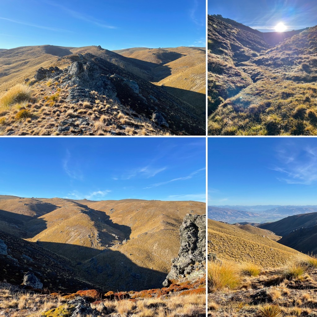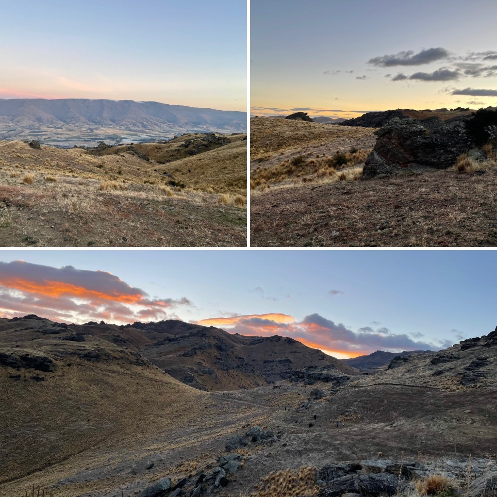 De ce que je me souvienne des indications de Terry, il s’agit de la boucle la plus difficile, non pas la plus longue mais la plus caractérielle en termes de dénivellation. Dans ce qui m’était resté de lucidité, je m’étais fixé l’heure de 6h00 pour repartir sur la dernière boucle, ce qui me permettrait de vivre le lever du soleil et de profiter de la journée entière pour finir de transformer l’essai. Cette dernière boucle commence par une longue ascension que mes jambes grimpent d’un bon pas pour retrouver ce fameux col de TW. Le soleil levant se joue de nous et ne baigne pas le flanc de la montagne sur lequel nous progressons. Je guette les rayons avec l’espoir d’en être rapidement frappé car le vent souffle sur les hauteurs. Balloté ici et là, le froid s’immisce dans les moindres espaces laissés libres. En contrebas, toujours cette vue sublime sur le lac Dunstan qui ne nous aura pas quitté du regard. Le paysage est toujours aussi désertique et teinté d’une nudité douce. Les plaines sont jonchées de vaches et de moutons, uniquement dérangés par le bruit de nos souffles pourtant étouffés par celui du vent.