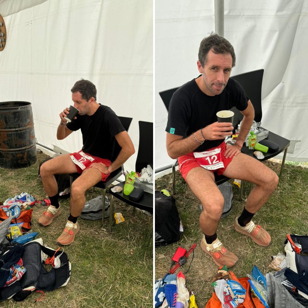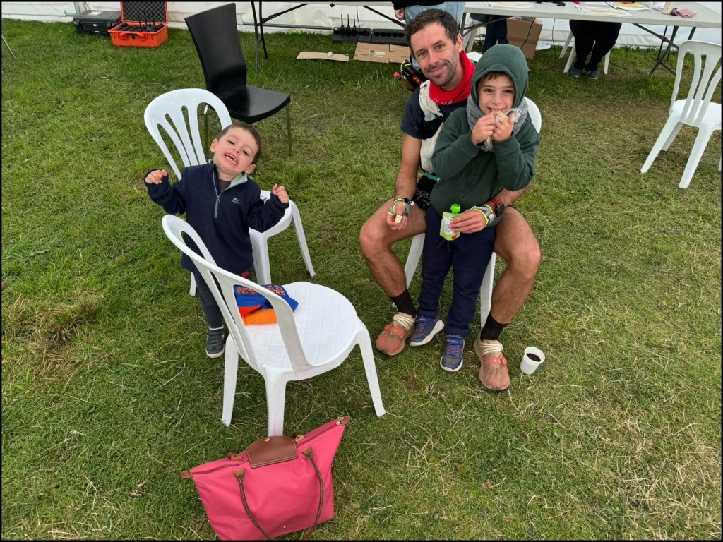 Au ravitaillement, je retrouve la petite famille avec deux boules de vie qui détonnent lorsqu’ils rentrent en collision avec l’enveloppe inanimée que je leur expose. S’ils savaient ma faiblesse mentale du moment et ce qui se joue dans ma tête. Je pose ce corps inerte, gonflé à l’émotivité, sur une chaise de jardin et pose les armes. Le regard bas et les yeux embués, je n’ose croiser leur regard et attend que le vide finisse de m’envelopper. Je suis en hypoglycémie mais n’ai pas envie d’y rétorquer. Machinalement je change mes chaussettes et tente de masquer cette tempête intérieure. En face j’aperçois une jeune femme qui échange avec son compagnon tout sourire et frais physiquement. Je suis en décalage face à cette image idyllique et par inadvertance je me plonge dans son regard. Il ne faut que quelques secondes avant qu’elle ne lise le fardeau que je porte et j’aperçois la peur la parcourir. Est-ce une projection sur ce qui pourrait arriver à son compagnon ? J’observe cette tente à laquelle je n’ai pas le sentiment d’appartenir.