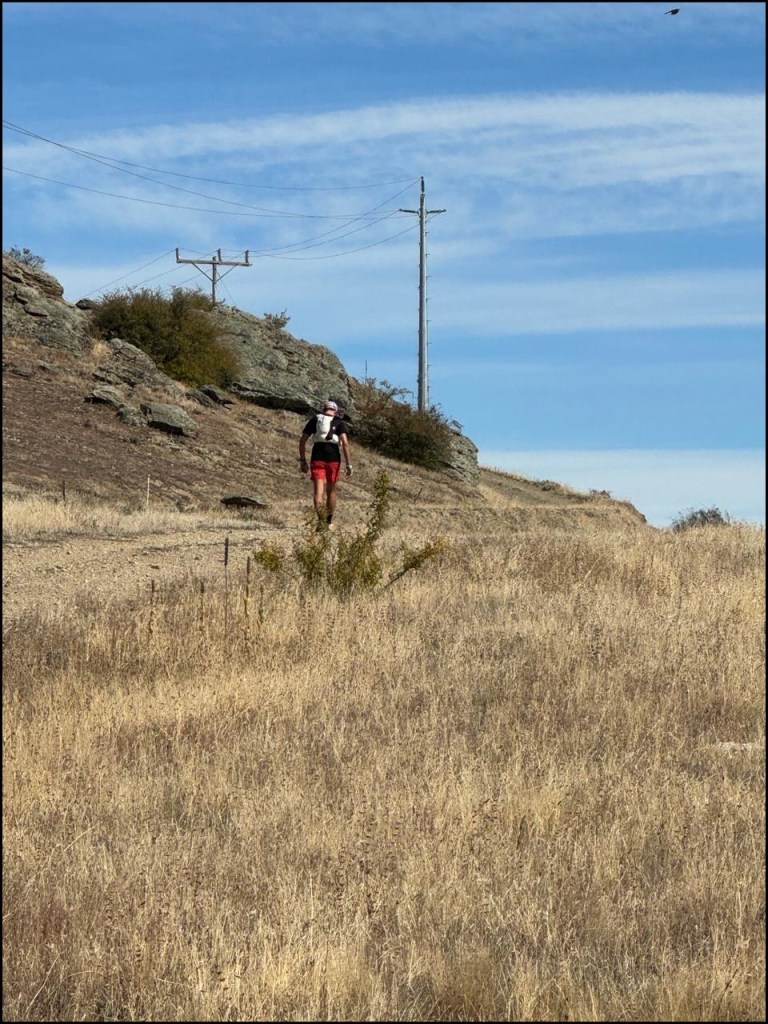 Après une bascule au point culminant de cette première boucle, nous reprenons le chemin de la plaine dans une descente agréable. Les jambes sont légères et la foulée sûre de sa démarche, uniquement freinée ici et là par quelques franchissements de barrières et le remplissage des gourdes sur les points d’eau disposés le long du parcours. La chaleur monte au même rythme que je descends et arrive bientôt à ma rencontre. Je me sens bien et évolue avec facilité et fluidité laissant derrière mes pas une impression de contrôle.