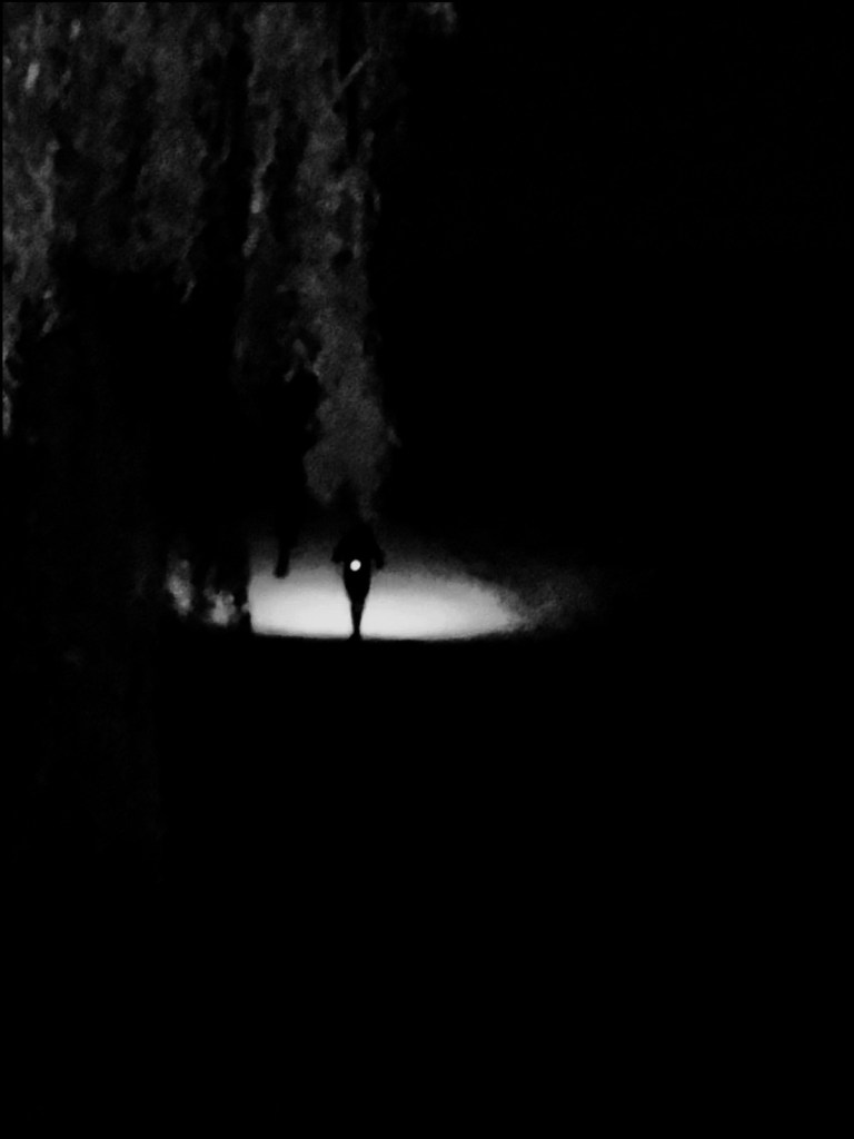 À côté de cette nouvelle réalité que mon esprit est en train de façonner, j’entre dans la nuit en m’accrochant à un wagon de 3 chercheurs d’or comme si ma survie en ce territoire devenu hostile en dépendait. Le groupe est constitué de deux femmes qui sont inscrites à la complétude de cette seconde boucle et de James, un « centmiler », celui-là même qui avait frappé Louise de sa générosité à la transition de la première boucle en cherchant le sac égaré d’une autre camarade d’aventure. Je me place à l’arrière de ce convoi et suit machinalement le rythme dans la descente. S’il me parait d’abord lent, je m’y accommode dans les premiers mètres et finalement m’emploierai à demi-mot pour rester au contact des heures durant. La descente se fait ainsi. Je charge mon sac de ces pépites minérales qui me permettront de rayonner à nouveau quand le jour pointera. Ma solitude à présent peuplée par ces collègues de galère, je suis pris d’une frénésie d’exister, comme pour nouer un pacte entre l’instant présent et l’ailleurs matérialisé par ce passage sur la ligne d’arrivée.