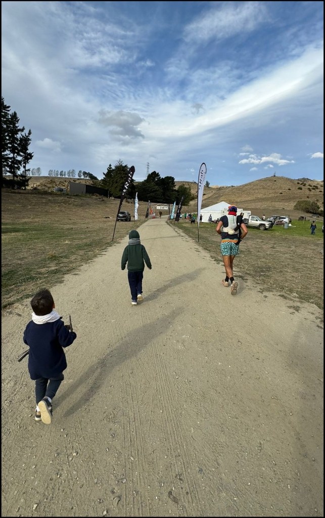 La plaine sous mes pieds, j’aborde la dernière bosse qui fait partie des nouveautés cette année. Lors du briefing, Terry a évoqué ce passage en expliquant qu’il était fatigué que chaque année les coureurs se plaignent de zigzaguer de longs kilomètres avant de retrouver l’arrivée salvatrice. Il a donc décidé de tracer une ligne au droit nous faisant passer par les reliefs. Cette dernière bosse se passe bien, c’est là encore très agréable et nombreux sont les arbres fruitiers qui peuplent ces alpages. D’ailleurs, arrivé en haut de cette aspérité, un pickup nous attend avec quelques fruits de saison, une pêche en poche je reprends mon chemin en me recouvrant car je pensais qu’en redescendant le vent faiblirait, mais il n’en est rien et il souffle de plus belle même à cette faible altitude. Je retrouve à présent le chemin le long de la route qui conduit de Cromwell à Northburn station. Déjà emprunté au petit matin, j’ai les repères suffisants pour savoir que la distance à couvrir est ridicule par rapport à toute celle déjà parcourue. Sur cette dernière portion, mon ego est aux manettes avec la volonté d’en terminer sous la barre symbolique des 36h. Je relance peu à peu et les derniers kilomètres défilent. Je longe des parcelles d’arbres fruitiers et la poussière dessine des tourbillons sous mes pieds. Le soleil est encore haut et inonde le lac sur ma gauche dont la surface est agitée par des clapotis incessants. Le dernier kilomètre est à présent annoncé et une excitation s’empare de mes jambes, je me sens apaisé, comme flottant à mon tour sous ce vent. La ligne d’arrivée apparaît et avec elle les enfants et Louise qui m’encouragent comme pour boucler une dernière fois ces boucles. La ligne franchie, tout se bouscule dans une explosion de sentiments. La fatigue est présente et quelques douleurs musculaires me rappellent la distance avalée, mais une sorte de béatitude règne. La joie d’avoir accompli ce que j’étais venu découvrir sur le sol néo-zélandais, une expérience intérieure intense, non maîtrisable mais finalement maîtrisée. La mue est terminée, je suis redevenu cet être sensible au monde et peux à présent le regagner.