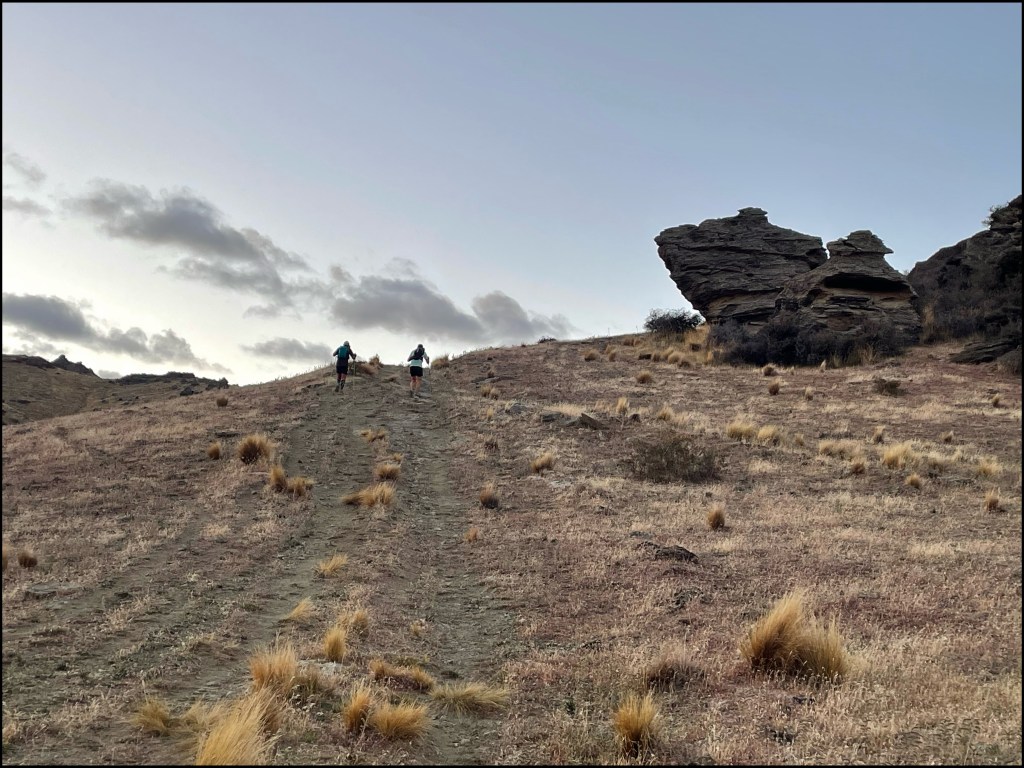 Nous évoluons dans la pénombre deux heures durant. Les premiers kilomètres défilent au rythme de la découverte des paysages alentours et de l’élévation des corps. La première boucle consistant en 25kms de montée puis 25 kms de descente, l’équation est jusqu’ici très simple. Dans les premiers pourcentages, les grappes humaines s’effilochent progressivement et je me retrouve vite seul avec une ou deux personnes en visuel devant comme derrière. Cette solitude de circonstance me convient. Si j’apprécie son esprit synthétique, la langue de Shakespeare n’est pas au programme de mon travail saisonnier. Je souhaite rapidement rentrer dans ma bulle afin d’allier économie et efficacité sans verbiage intempestif. L’esprit de découverte et la curiosité « motorisent » mes pas qui se font machinaux et réguliers. Ce monde magnifique à l’ombre des alpes néo-zélandaises m’apparait comme un environnement rude marqué par des étés torrides et des hivers glacés. Le paysage est désertique et les prés environnants arides et secs. Les arbres semblent avoir été chassés au profit de cette mousse jaunie et résistante qui parsème ce désert de pierre et craque sous les pieds.
