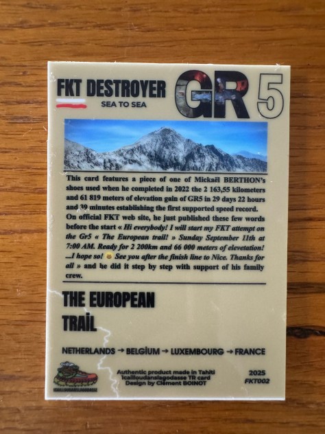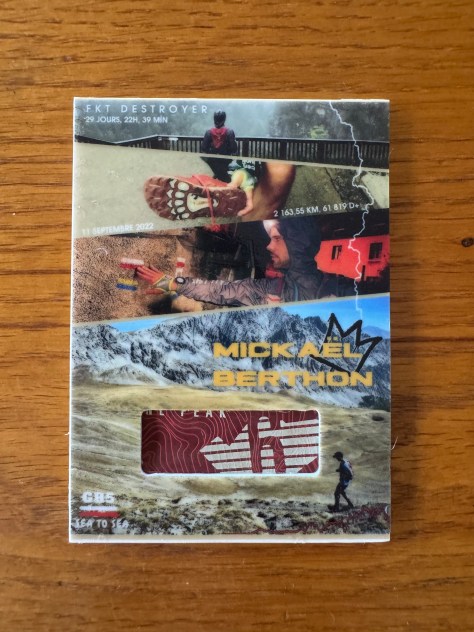 Et en filigrane des chiffres… démesurés… 29 jours 22 heures 39 minutes ; 2 163,55 km ; 61 819 mètres de dénivelé ; 5 comme le GR ; 4 comme le nombre de pays traversés ; « sea to sea » devenu « see to see » le temps d’un hommage pour que reste une trace de la trace d’un projet fait d’encre sur une carte.