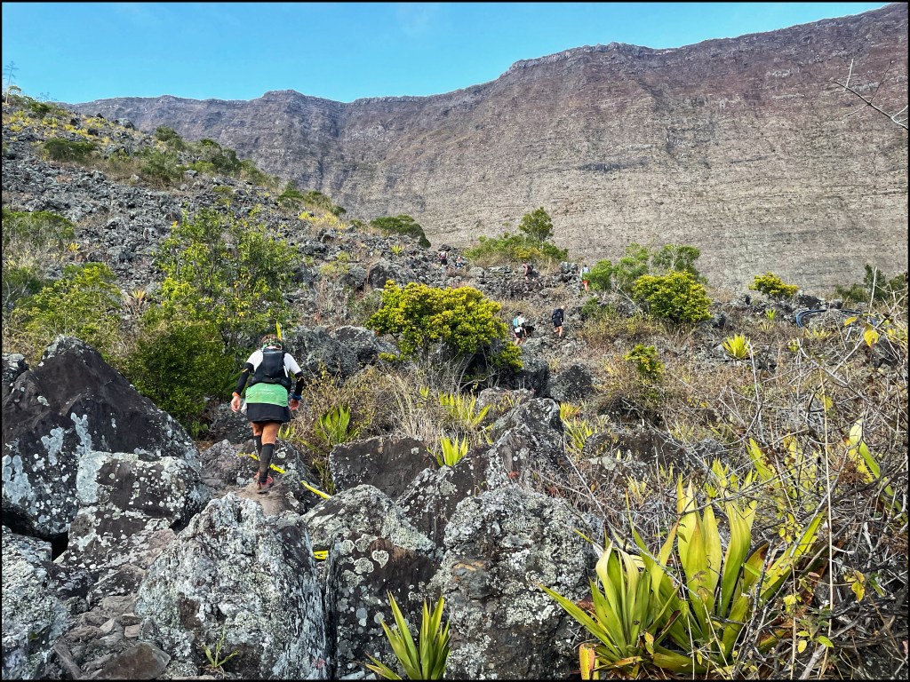 Une fois cet état de contemplation dissipé, nous abordons une descente technique et l’avance sur mes prévisions horaires qui jusqu’ici ne faisait que croitre, fond petit à petit. Depuis le début, cette course au temps ne m’apparait pas comme un but absolu mais comme un petit supplément qui viendrait valider une abnégation au quotidien. Si la recherche de la performance n’est pas quelque chose qui m’anime, assister à l’aboutissement d’un long travail d’adaptation, généré suite au stress physique et physiologique d’une longue préparation, titille ma (dé)formation scientifique. La capacité d’adaptation du corps, le juste calcul entre stress et récupération, l’équilibre précoce entre charge et intensité font du chemin qui précède la balade, matérialisé depuis quelques heures et encore pour quelques heures, une source d’apprentissage inépuisable. Se connaitre soi-même sans avoir même la moindre idée de ce qu’il est réellement possible de faire, où il est réellement possible d’emmener ce véhicule, sans même connaitre réellement le pilote, une équation à nombreuses inconnues, mais est-elle seulement soluble ?