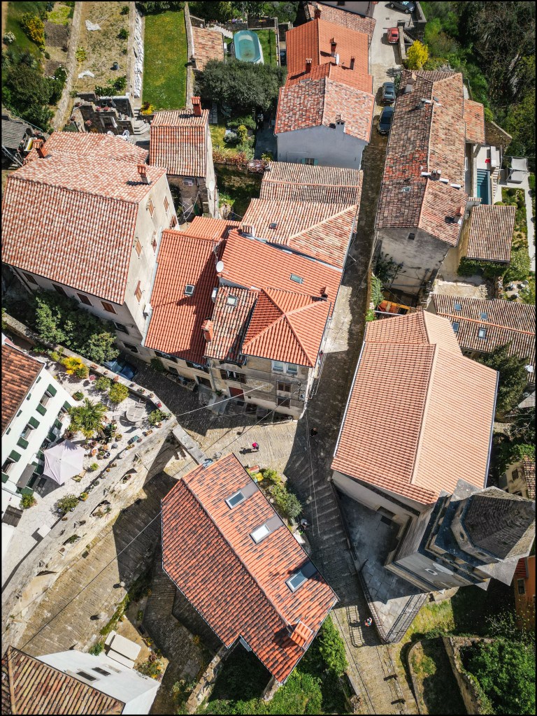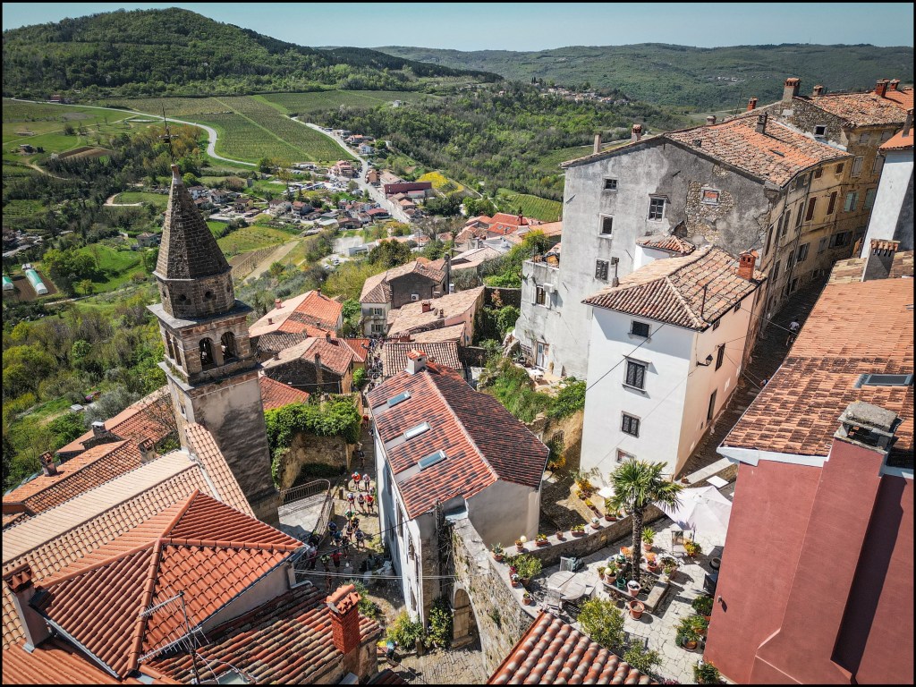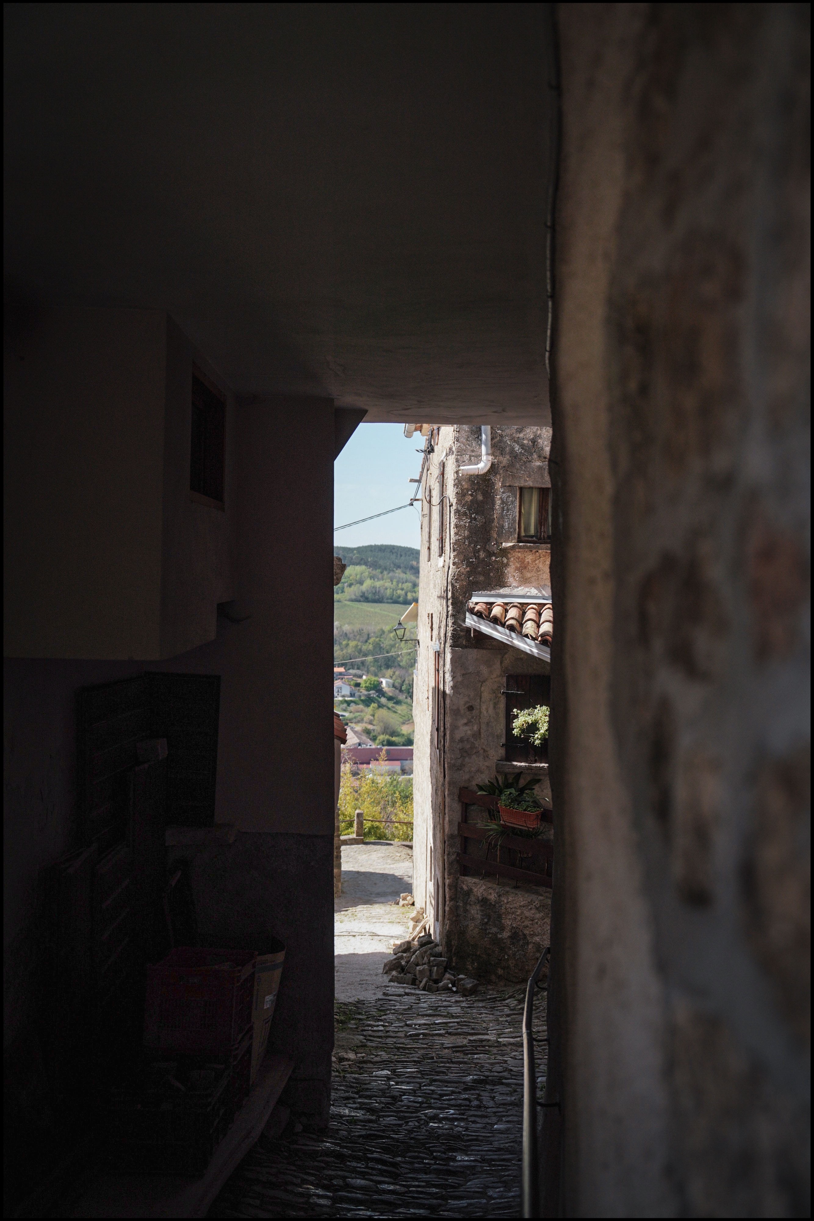 Je quitte Buzet l’esprit léger et les jambes soulagées en direction de Livade avec sur la route le village de Motovun, jonché en haut d’une petite colline, son regard embrassant toute la vallée de Mirna. Nous y avons fait étape quelques jours auparavant. Les boutiques sentent la cave et la poussière, au sol des pavés, à perte de pas, le village de Motovun se dresse en forteresse qui ne se laisse conquérir qu’à la force des jambes pour que défilent ses rues étroites. Nous attaquons son flanc par les champs, sorte d’arrivée en catimini comme pour ne pas nous faire repérer par sa haute tour de garde, vient ensuite une portion de route goudronnée qui monte dans la pente avant les pavés et sous les pavés, la truffe…